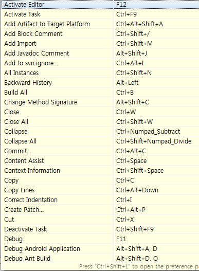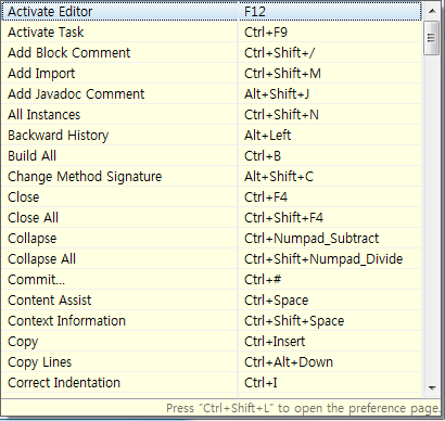 Ctrl + Shift + Space : 메소드 괄호에 커서를 놓고 이 키를 누르면 파라미터 힌트 보여줌