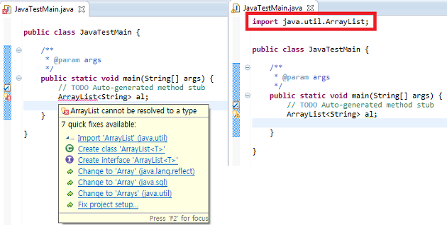 Ctrl + 1 (빠른 교정) – 구문에 맞게 소스 교정 지원