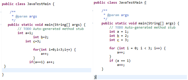 왼쪽 소스처럼 들여쓰기가 제대로 되지 않은 소스를 오른쪽 소스처럼 정렬해준다.