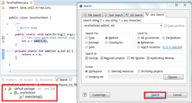 찾고 싶은 메소드나 클래스의 이름을 클릭한 후 Ctrl+H를 클릭하면 Search라는 창이 나오고 Search버튼을 누르면 하단에 Search탭에서 해당 메소드 또는 클래스가 호출된 위치를 찾아준다.