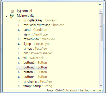 Ctrl + Space : 소스에서 사용 가능한 메소드, 멤버 리스트