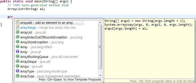 아래에서 arr을 치고 Ctrl+Space를 누르면 현재 작성할 수 있는 클래스, 함수, 변수 등을 표시해준다.